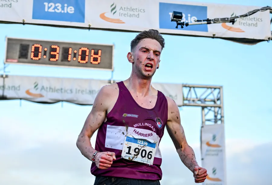 Cormac Dalton crossing the line in the 2024 123.ie National Senior Cross Country Championships